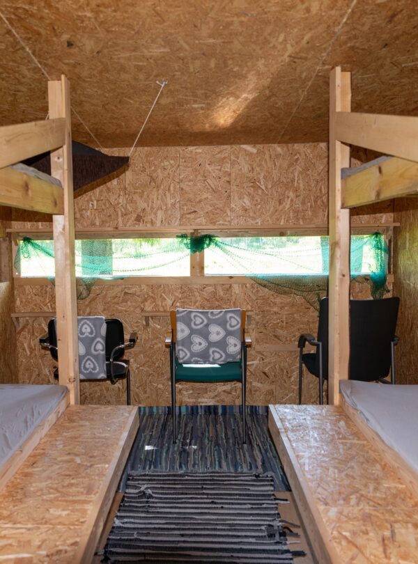 The Brown Bear and wildlife watching hides are simple, comfortable, and cosy. There are 2 hides, each one of them has room for 9 persons. Both hides have separated cabins with bunk beds and a dry toilet. One cabin has room for 4 persons – 2 bunk beds/4 sleeping places in total. One bed is situated between the 2 cabins.